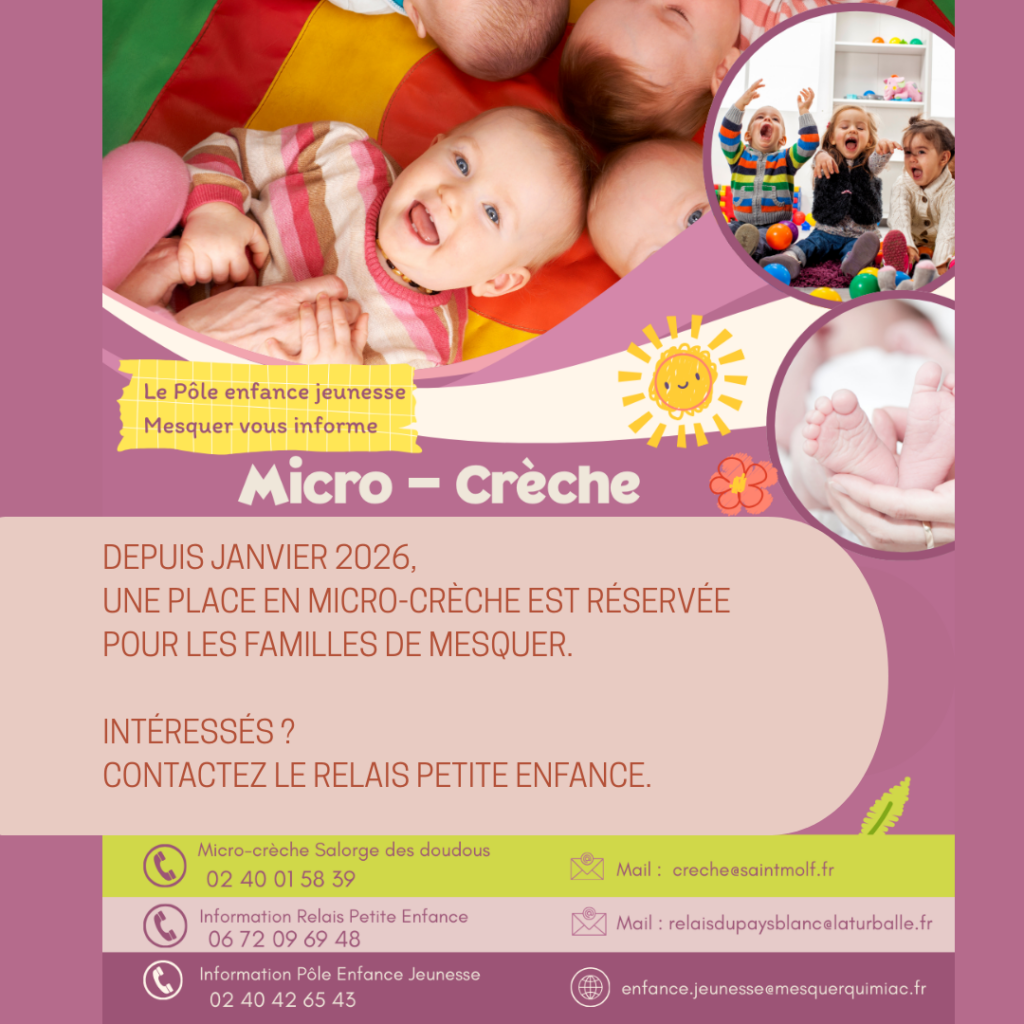 La micro-crèche « LES DOUDOUS EN COULEUR »est un service public géré par la mairie de Saint-Molf et qui assure, pendant la journée, un accueil d’enfants âgés de 2 mois jusqu’à leur entrée à l’école (maximum 4 ans).